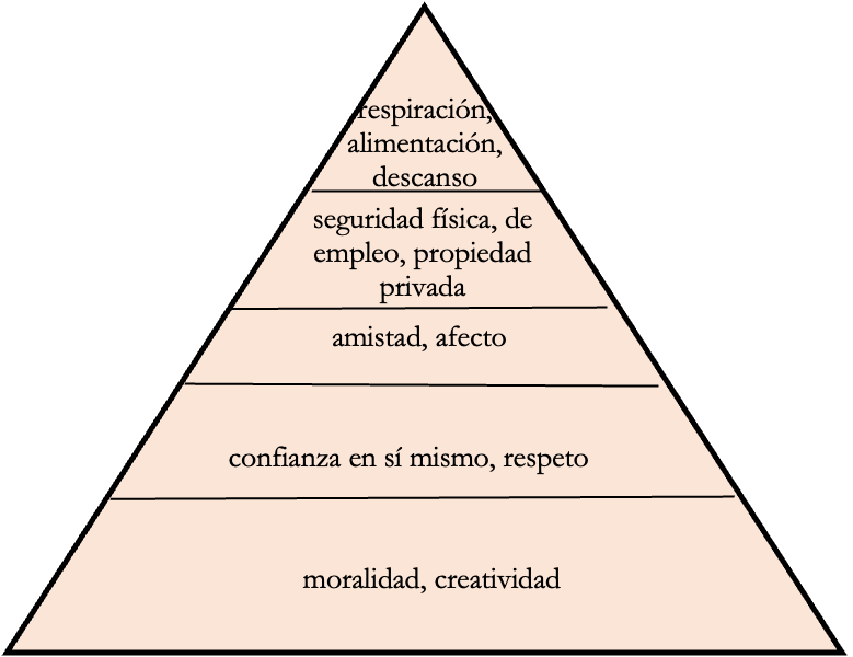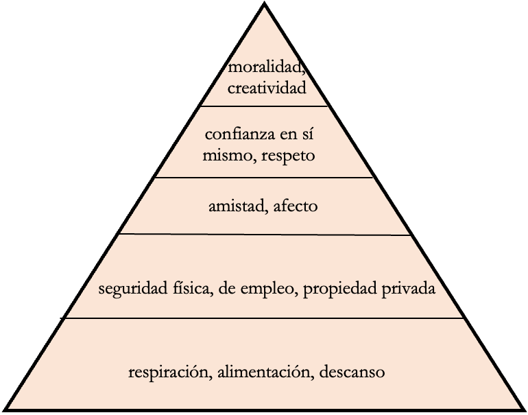 Entonces, no debemos sorprendernos que en la persona humana haya realidades que en la realidad se oponen a lo evidente. Cuando Maslow desarrolla su teoría sobre las necesidades humanas, él se fija en la realidad que rodea al ser humano. Lo primero que observa es que tiene una dimensión corporal; y que esa dimensión exige para subsistir el abrigo, la nutrición, la sed, el cuidado de la salud, el descanso, etc. Luego piensa en los peligros que pueden amenazar su subsistencia; y entonces, considera lo que requiere para tener una seguridad: de vida, la propiedad privada, el empleo, etc. Más adelante considera que la persona humana vive en sociedad, que requiere la aceptación de otros, y piensa en la necesidad de amistad y de afecto. Luego, se fija en el hecho de que uno requiere confianza en sí mismo para emprender proyectos; y finalmente, termina con el nivel de autorrealización, que supone la moralidad, la creatividad, la solución de problemas.
