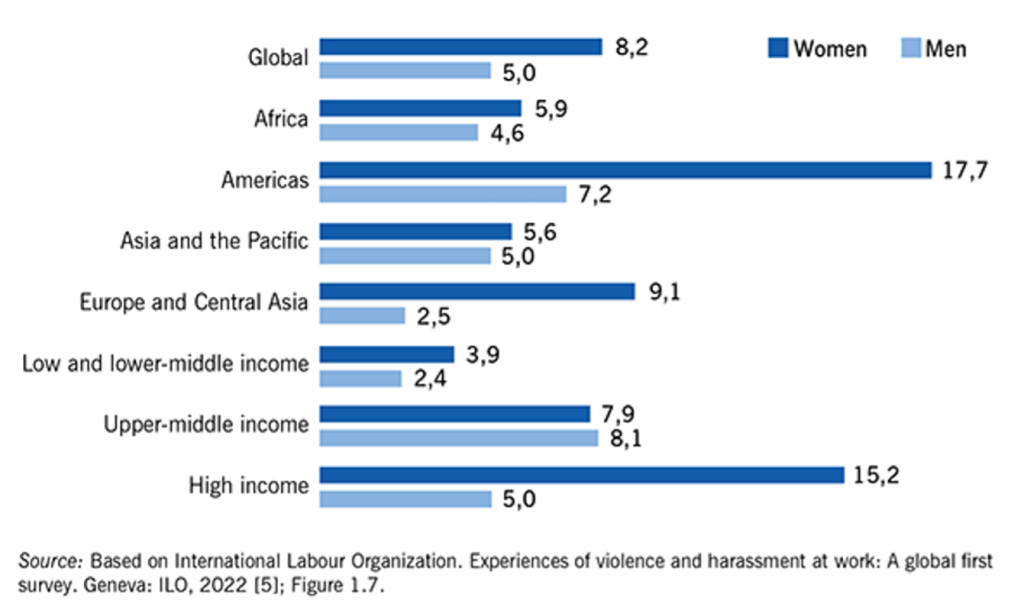 Figura 1. Porcentaje de empleados que han experiementado violencia o acoso sexual en el trabajo por región, por nivel de ingresos del país y por sexo, 2021