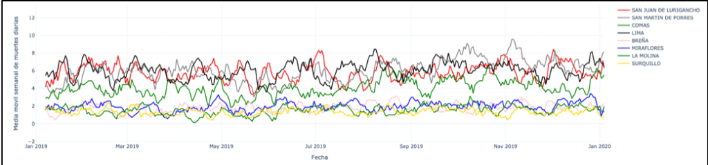 La Figura 2 muestra la distribución de muertes diarias en 8 distritos de Lima Metropolitana desde enero de 2019 hasta febrero de 2021. Se puede observar que en todos ellos existe un comportamiento similar en el número de muertes por distrito de enero de 2019 a enero de 2020. Este comportamiento, sin embargo, se modifica sustancialmente desde los primeros días de febrero 2020, y se mantiene así hasta febrero 2021.