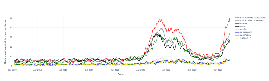 Esta gráfica nos llevaría a concluir que desde enero 2019 hasta enero 2020, las diferencias en los números de fallecidos entre un distrito y otro no fueron significativas, a pesar que entre ellos el número de habitantes es sustancialmente distinto. Por ejemplo, San Juan de Lurigancho tiene una población de 1’038,495 habitantes y Breña solo llega a 85,309 habitantes, según el censo de 2017. Podríamos afirmar, entonces, que en condiciones ordinarias, todos los distritos de Lima Metropolitana tienen un número más o menos semejante de fallecidos.