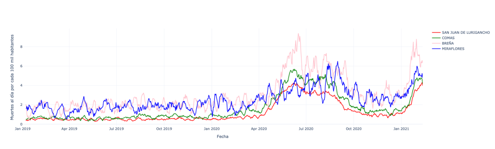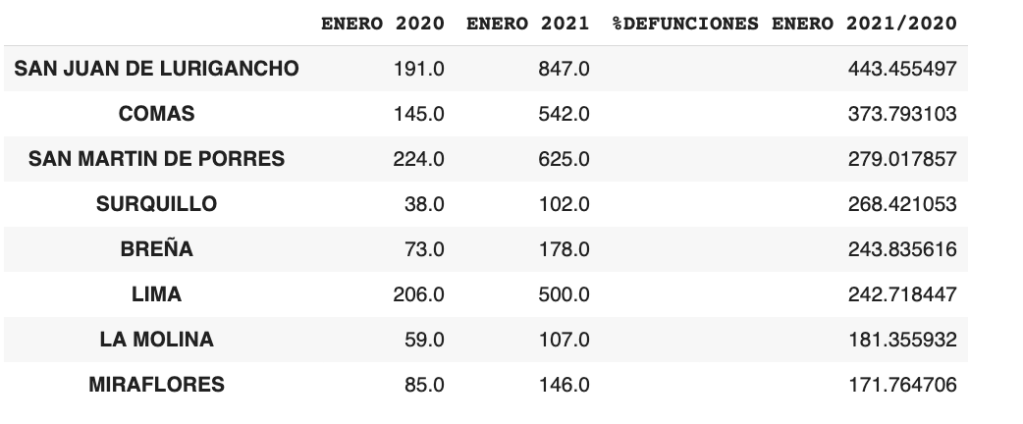 Según este análisis, el número de fallecidos en un mes en el distrito de San Juan de Lurigancho se incrementa en 4.43 veces cuando se compara el mes de enero 2021 con el mes de enero 2020. En cambio, el número de fallecidos en un mes en el distrito de Miraflores en esos mismos meses, se incrementa 1.71 veces. El comportamiento de los otros distritos analizados está entre estos dos valores.